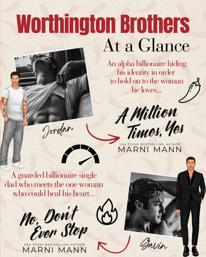 No, Don’t Ever Stop is another wonderful, sexy billionaire romance from Marni Mann. A complementary story to A Million Times, Yes, it takes place at the same time as Maya and Jordan’s story and tells the romance of Maya’s bestie/roommate Emily and her secret romance with Jordan’s brother, single dad Gavin.