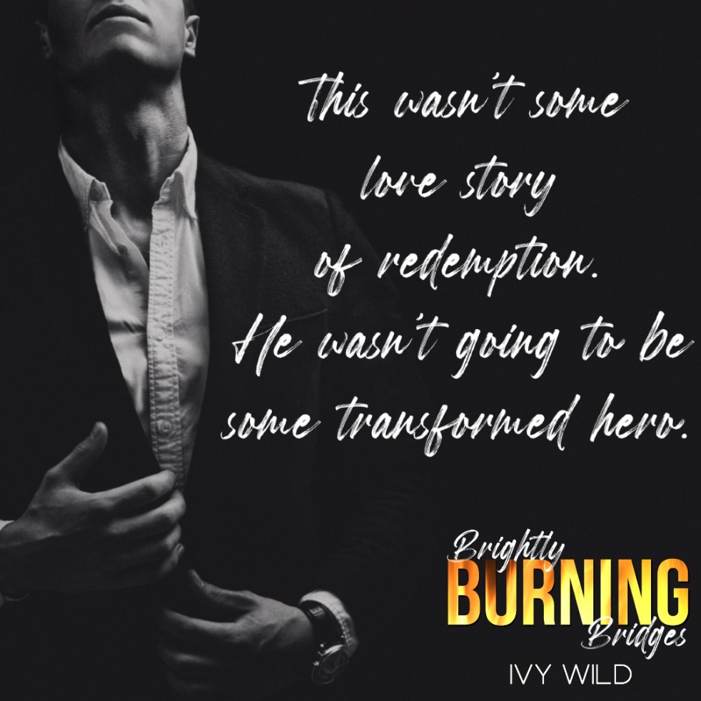 Ivy Wild is a new-to-me author, so I went into Brightly Burning Bridges with no knowledge of Silas. I’ve gathered from the previous books that he was really a jerk, and while there are some alphahole tendencies, I wouldn’t classify this as a bully romance. He’s mean and gives you whiplash, but I wouldn’t necessarily classify him as a bully. But I digress…